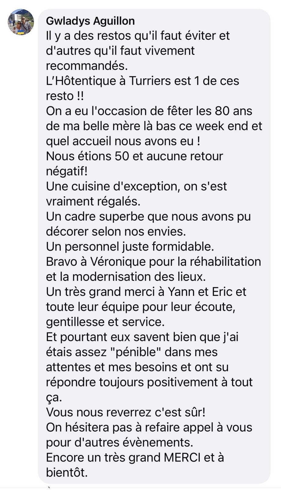 Ce dimanche 3 mars était un jour particulier car nous fêtions les 80 ans d’une charmante Mamie « sonnée » par la surprise faite par sa famille. L’Hôtentique avait mis les petits plats dans les grands pour cette réception. Pour ce faire l’établissement avait été entièrement privatisé et la fête fut grandiose.