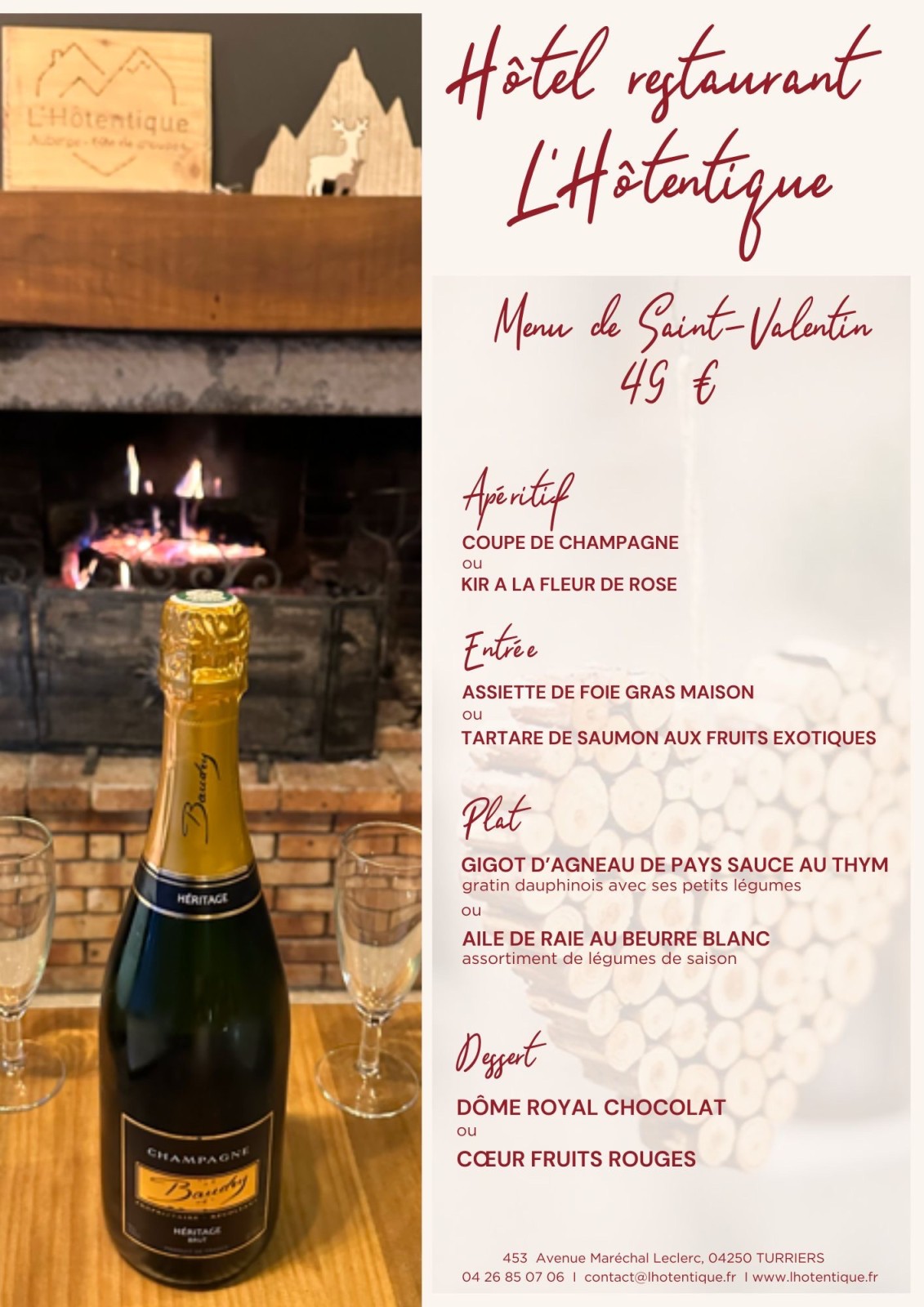 - le repas de la St Valentin spécialement élaboré par notre chef Alex à 49€ par personne (ou la carte à disposition)